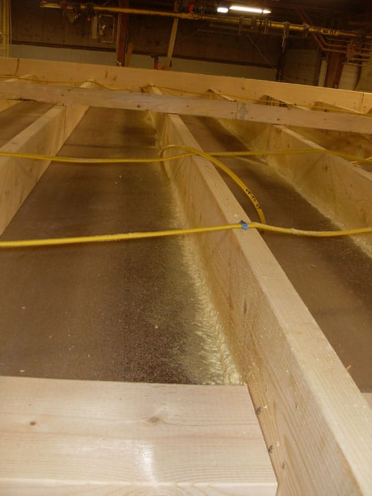 Ceiling drywall is adhered using state of the art spray adhesive instead of standard fasteners to eliminate the possibility of nail pops once a structure has settled.