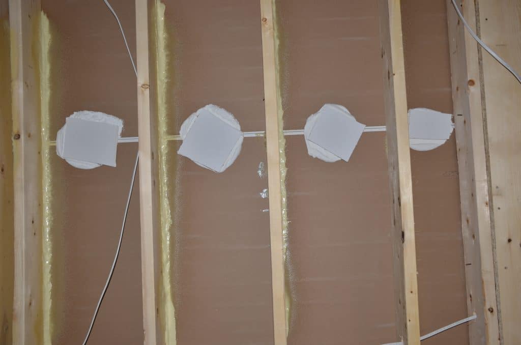 To ensure energy efficiency, spray foam insulation is installed to seal all exterior wall receptacle outlets, a batt insulation fills the exterior wall cavities and DOW Rigid Foam Insulation is inserted between the exterior wall and the interior drywall in all pipe and conduit areas
